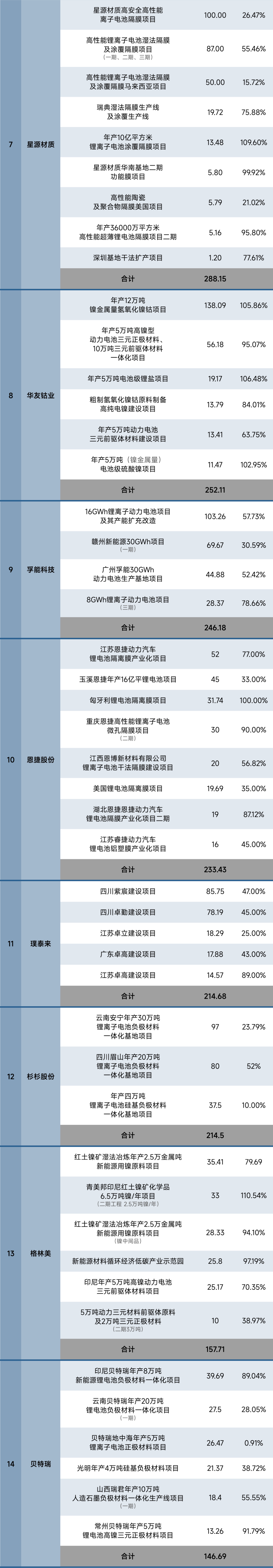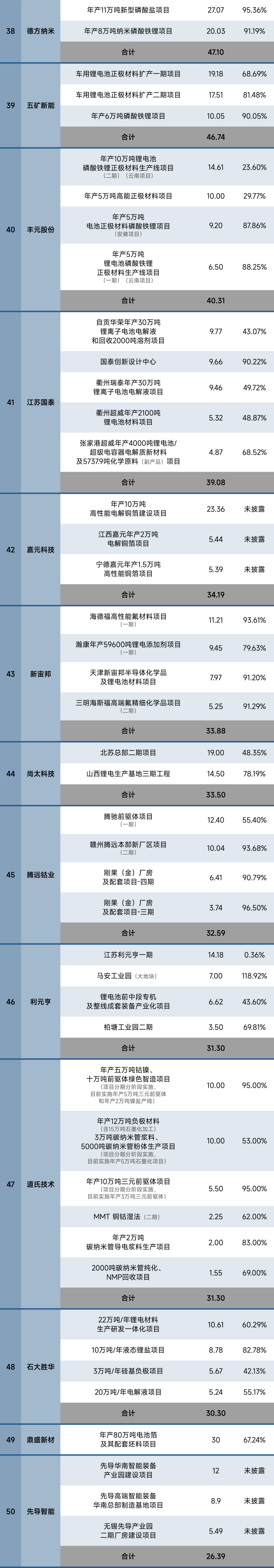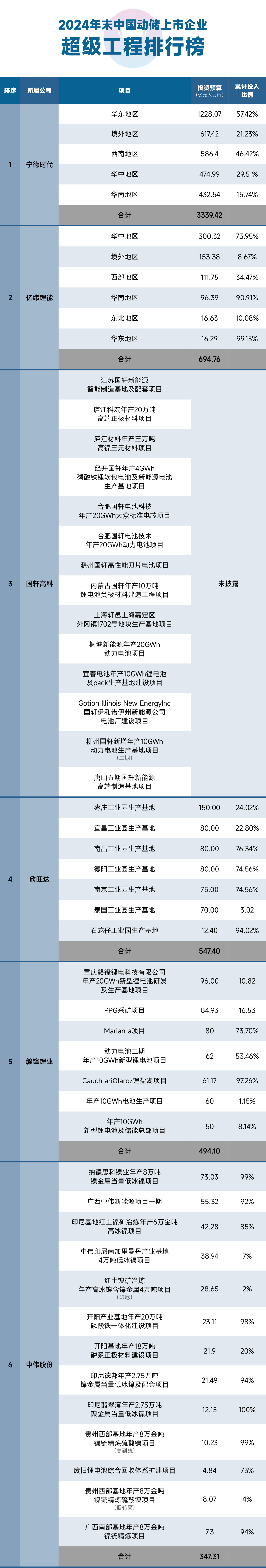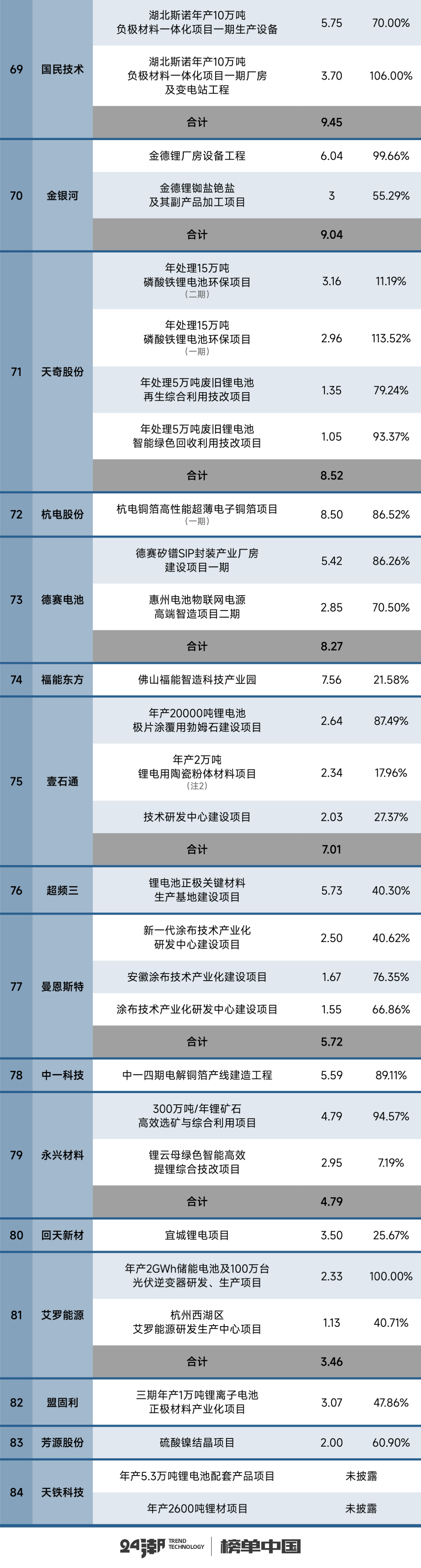 据24潮产业研究院(TTIR)统计,截止2024年末,国内仅83家锂电上市公司超320个超级工程(单个项目投资预算在亿元以上)进入执行(施工)阶段,项目总投资预算超10000亿元,约同比增长28%。涵盖动力与储能电池制造、钴锂镍等上游原材料、正负极材料、电解液、锂电隔膜、锂电铜箔等整个锂电产业链。