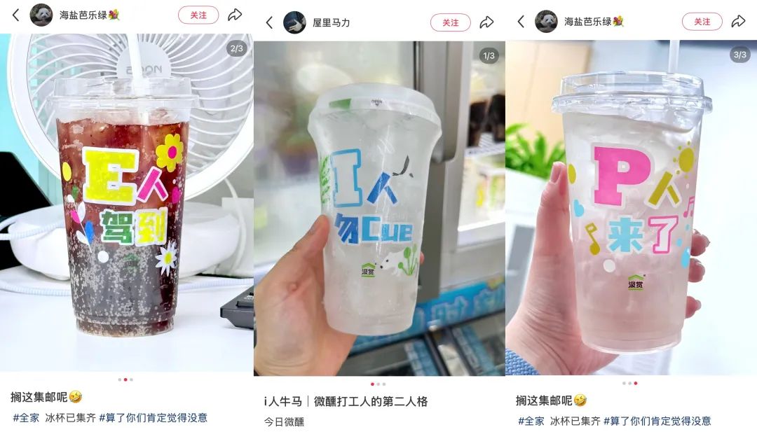 4种不同瓶身上的“E人驾到”、“I人勿cue”等人格专属标语,既能帮助消费者表达个性,也进一步放大了社交传播的触点,引得消费者纷纷打卡“集邮”4种冰杯。