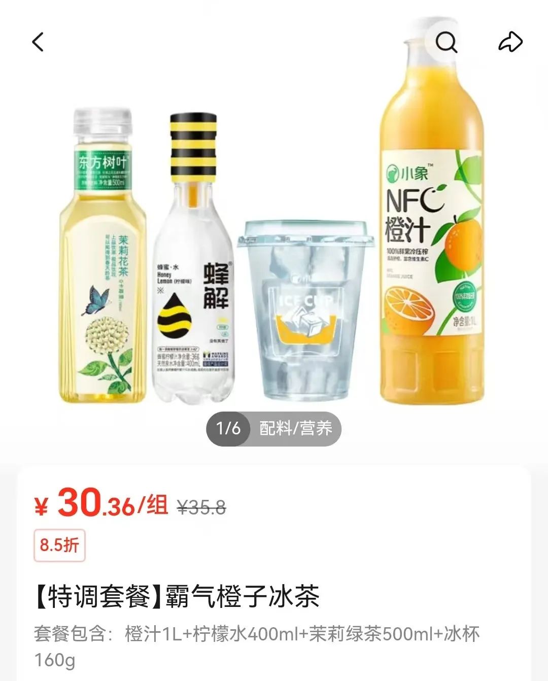 前不久,美团小象超市在线上推出一组霸气橙子冰茶套餐,里面包含小象自营的NFC橙汁、东方树叶的茉莉绿茶、一杯冰杯和一瓶柠檬水,消费者下单后送到家,就可以在家调配出冰爽的夏日饮品。