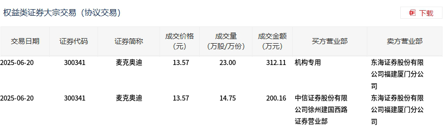 6月20日,麦克奥迪大宗交易成交37.75万股,成交额512.27万元,占当日总成交额的6.6%,成交价13.57元,较市场收盘价15.12元折价10.25%。