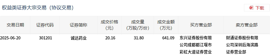 6月20日,诚达药业大宗交易成交31.8万股,成交额641.09万元,占当日总成交额的16.32%,成交价20.16元,较市场收盘价20.57元折价1.99%。