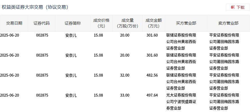 6月20日,安奈儿大宗交易成交105万股,成交额1583.4万元,占当日总成交额的15.08%,成交价15.08元,较市场收盘价14.9元溢价1.21%。