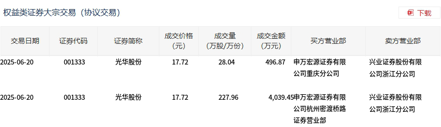 6月20日,光华股份大宗交易成交256万股,成交额4536.32万元,占当日总成交额的59.78%,成交价17.72元,较市场收盘价19.58元折价9.5%。