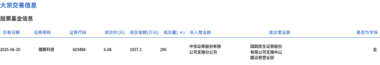 6月20日,展鹏科技大宗交易成交290万股,成交额1937.2万元,占当日总成交额的43.28%,成交价6.68元,较市场收盘价7.43元折价10.09%。