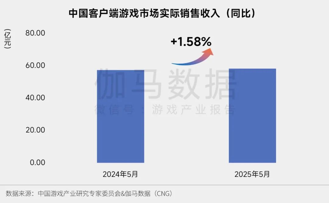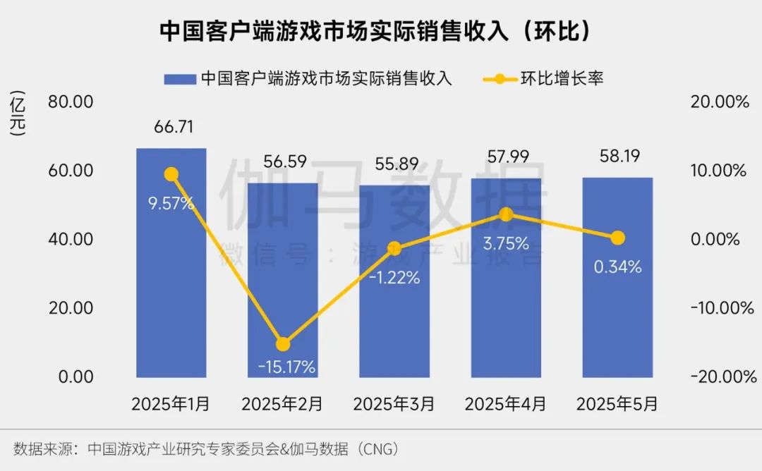 2025年5月,中国客户端游戏市场规模为58.19亿元,同比增长1.58%,环比增长0.34%。本月客户端游戏市场增量主要由新品、次新品带来。