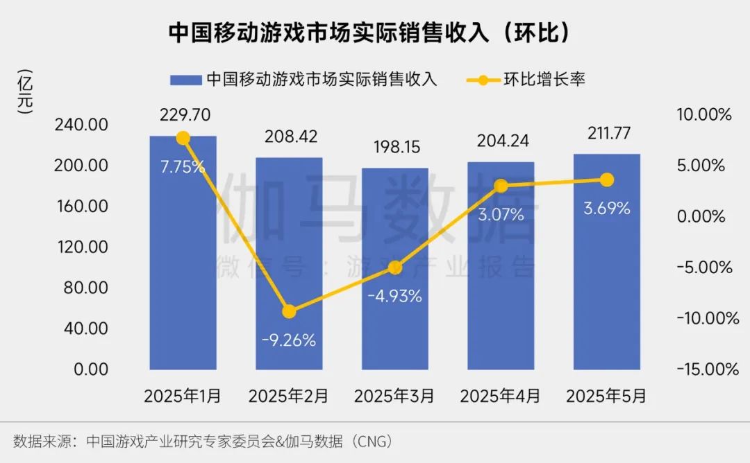 2025年5月,中国移动游戏市场规模为211.77亿元,同比增长11.96%,环比增长3.69% 。本月新品及成熟期产品中均有部分产品表现较佳。
