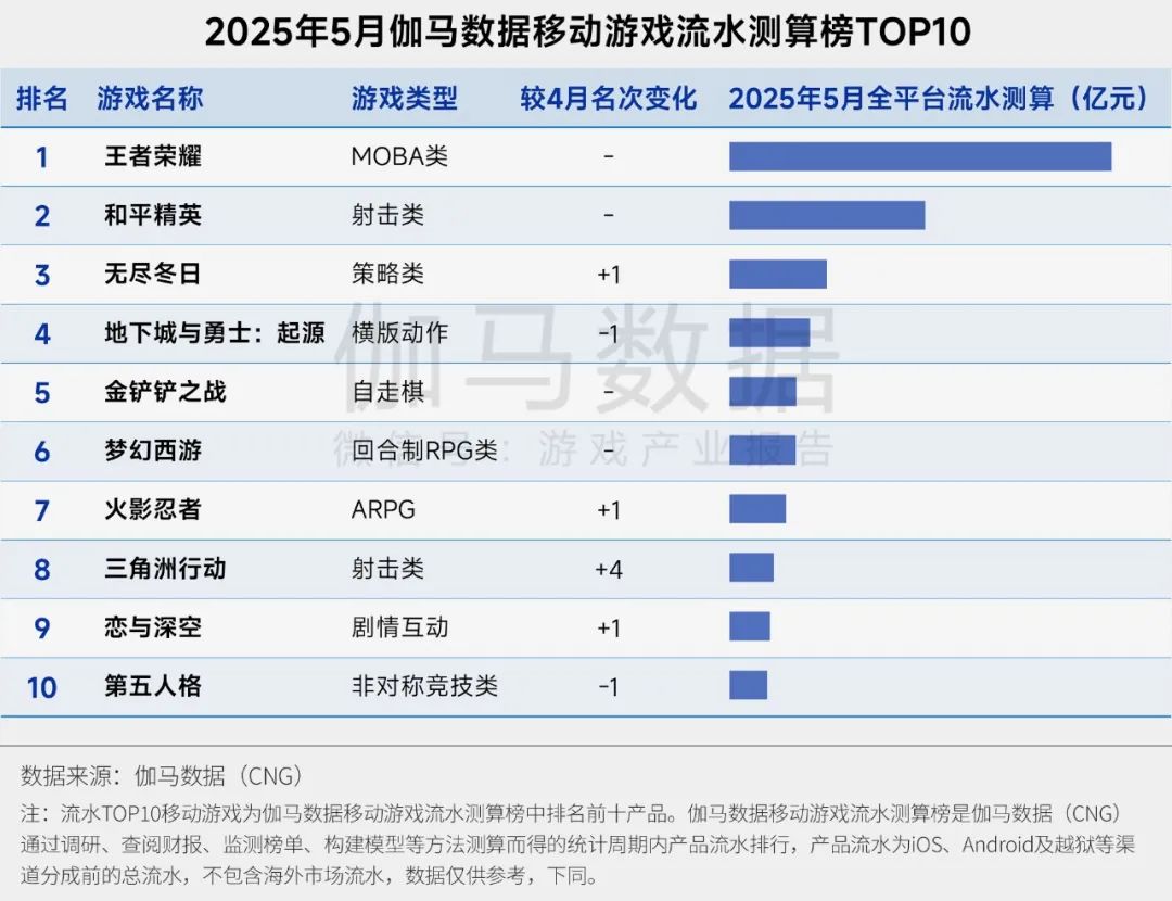 2025年5月,《三角洲行动》在伽马数据移动游戏流水测算榜中上升4位,进入TOP10,位列第8名,TOP10中8款产品排名上升或不变。