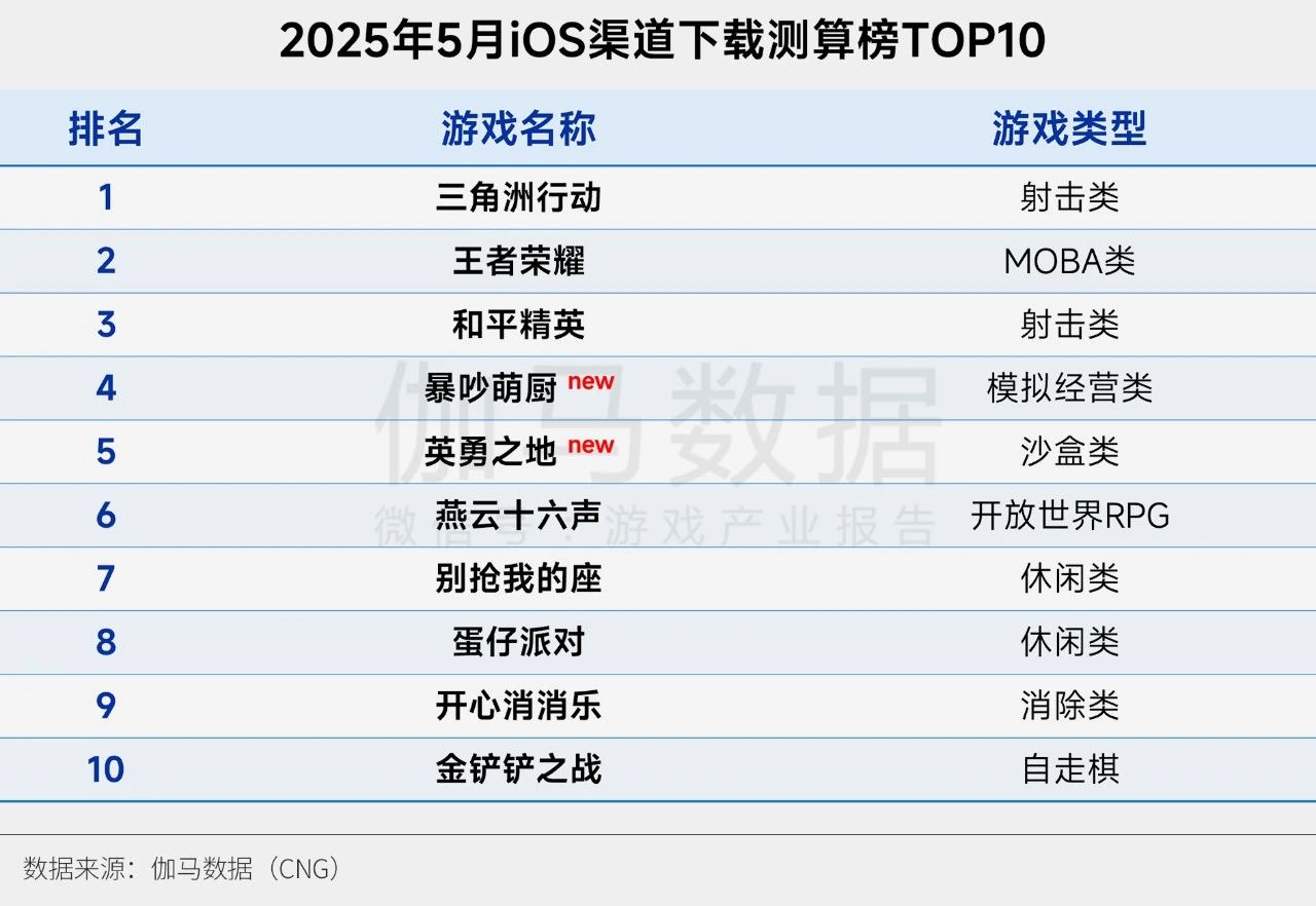 2025年5月伽马数据iOS渠道下载测算榜TOP10中,《三角洲行动》再次位列榜首,新游《暴吵萌厨》《英勇之地》入榜。