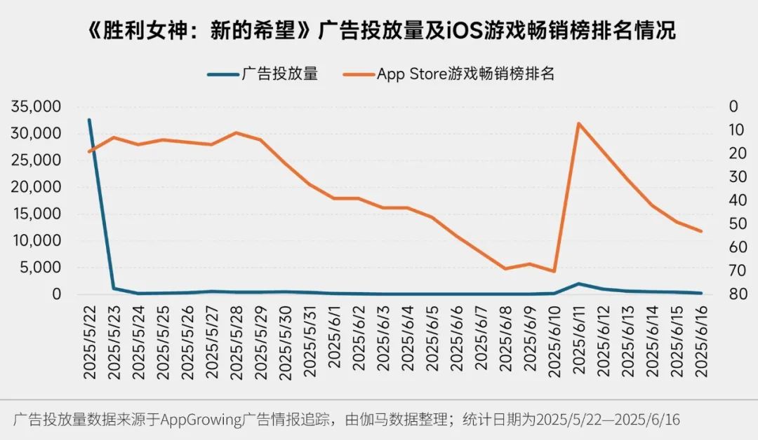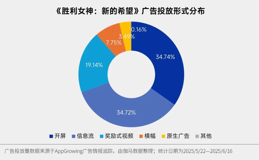 《胜利女神:新的希望》由韩国SHIFT UP公司开发,于5月22日上线国内市场,游戏广告投放量集中于上线当日;统计日期内,《胜利女神:新的希望》App Store游戏畅销榜排名在5月29日后呈下降趋势,而得益于6月10日推出的全新版本“记忆与遗忘” ,游戏于次日进入App Store游戏畅销榜TOP7。从游戏广告投放形式来看,游戏广告以开屏、信息流广告为主,两类广告合计占比达69.46%。