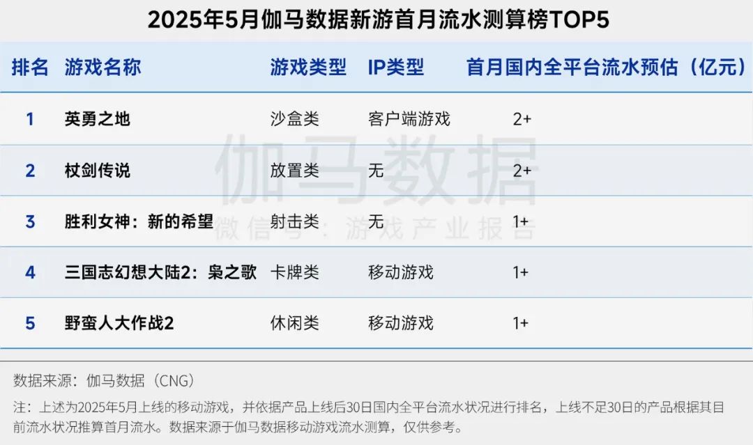 2025年5月,伽马数据新游首月流水测算榜(不含客户端流水)TOP5中,沙盒类新游《英勇之地》位列榜首,5款游戏首月流水预估均超亿元(含iOS+Android )。