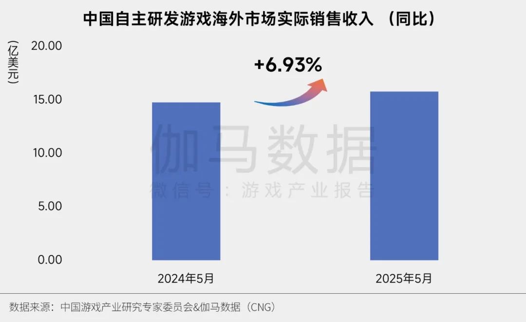 2025年5月,中国自主研发游戏海外市场实际销售收入为15.77亿美元,同比增长6.93%,环比增长1.50%,环比增量主要来自《Kingshot》《Genshin Impact》(原神)等。