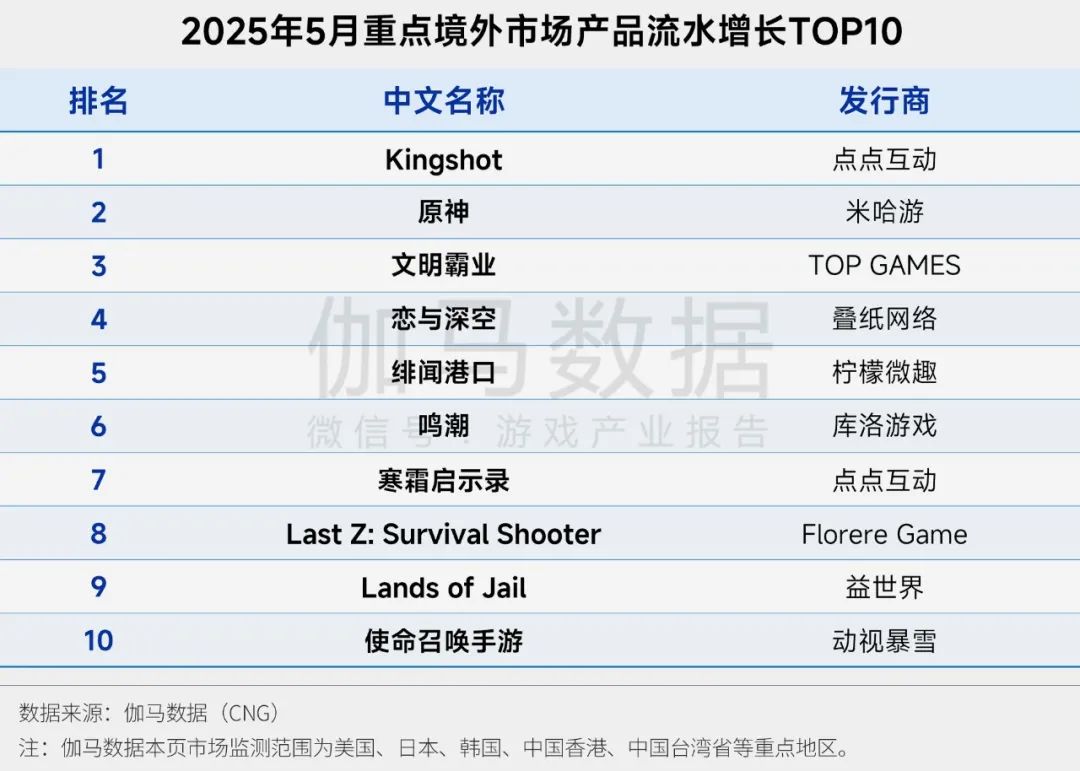 2025年5月重点境外市场产品流水增长TOP10中,《Kingshot》延续此前的增长趋势,本月实现收入翻倍增长,位列境外市场产品流水增长榜榜首。