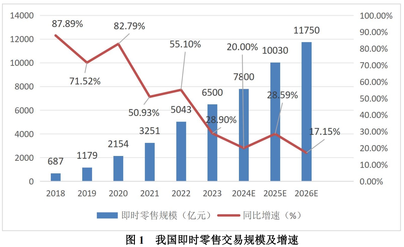 商务部国际贸易经济合作院发布的《即时零售行业发展报告(2024)》测算,2023年我国即时零售规模达到6500亿元,同比增长28.89%,比同期网络零售增速高出17.89个百分点。