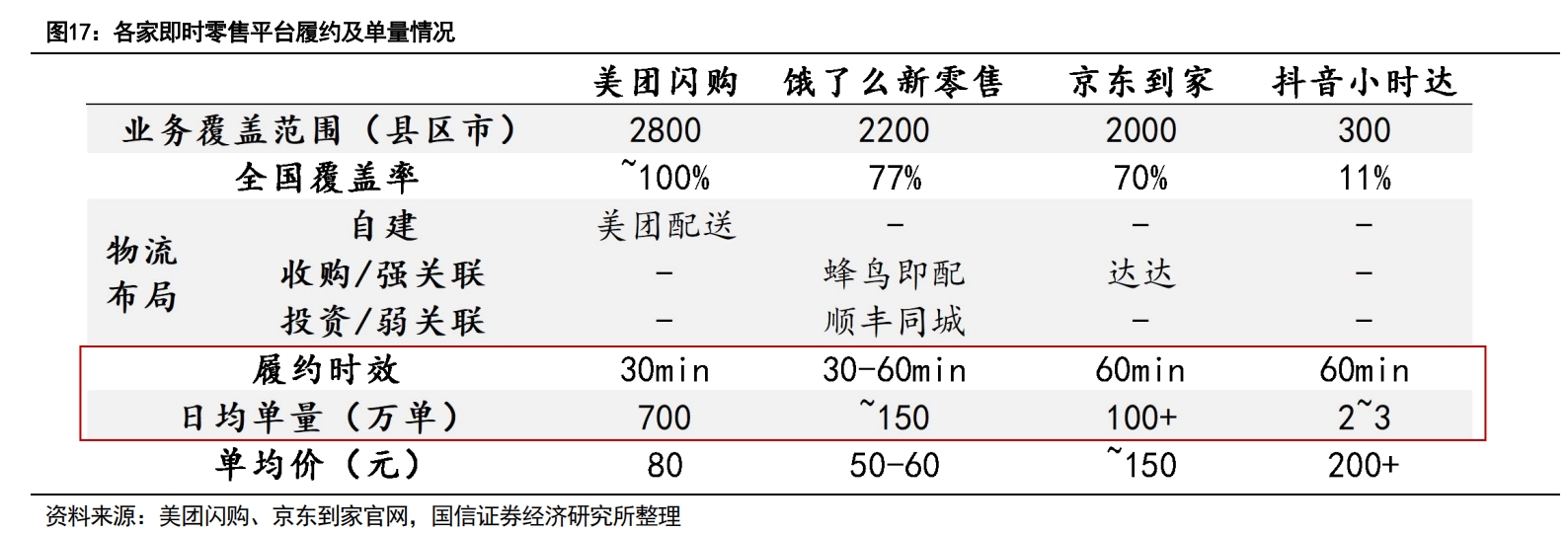 即时零售平台的单量排名依次是美团、饿了么、京东、抖音。看得出来,即时零售天然和外卖业务相连。