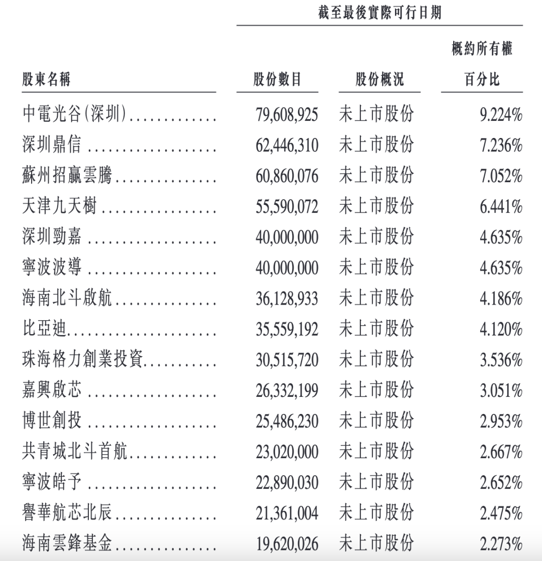 但该公司目前并没有控股股东,上市前,中电光谷(深圳)持股9.224%、招银国际通过苏州招赢云腾持股7.052%、深圳鼎信持股7.236%、CPE源峰通过天津九天树和杭州泓聿合计持股8.336%、宁波波导持股4.635%、比亚迪与其员工跟投平台嘉兴创启开盈合计持股4.168%等。