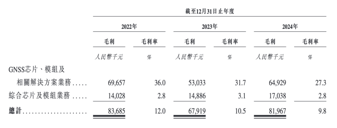 而代表其自主技术实力的GNSS芯片业务,在报告期内贡献的营收占比不到3成,尽管这项业务的毛利率分别有36%、31.7%和27.3%,但也呈现出逐年下降的趋势。