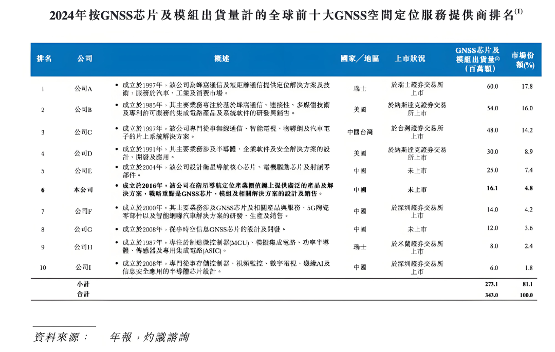 按双频高精度射频基带一体化GNSS定位芯片及模组出货量计,该公司在全球GNSS定位空间服务提供商中位居第4,在中国内地公司中位居第一,全球市场份额为10.5%。行业第一名的市场份额为32.3%。