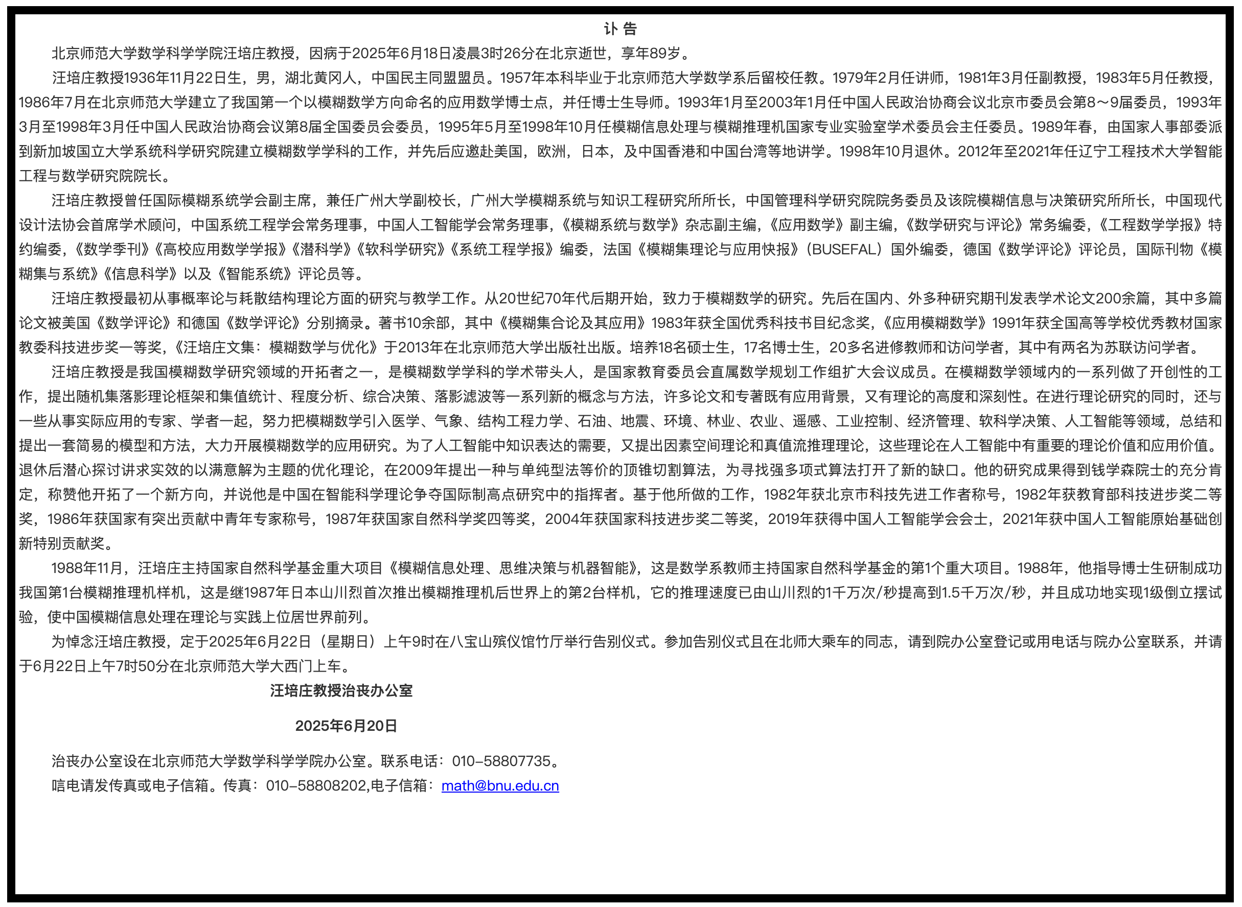 6月20日,北京师范大学数学科学学院发布讣告:北京师范大学数学科学学院汪培庄教授,因病于2025年6月18日凌晨3时26分在北京逝世,享年89岁。
