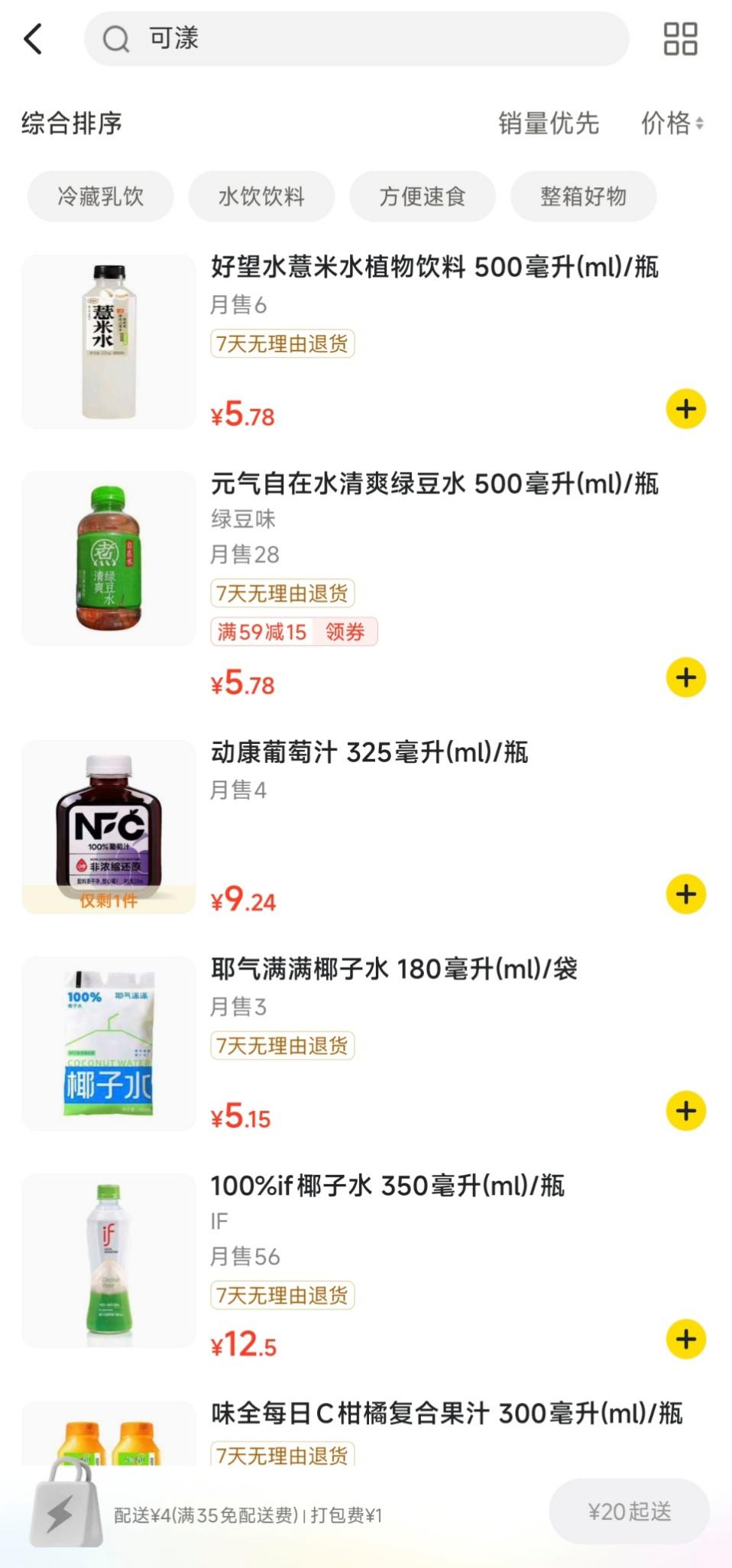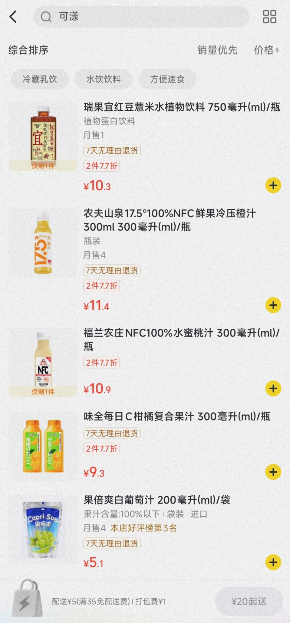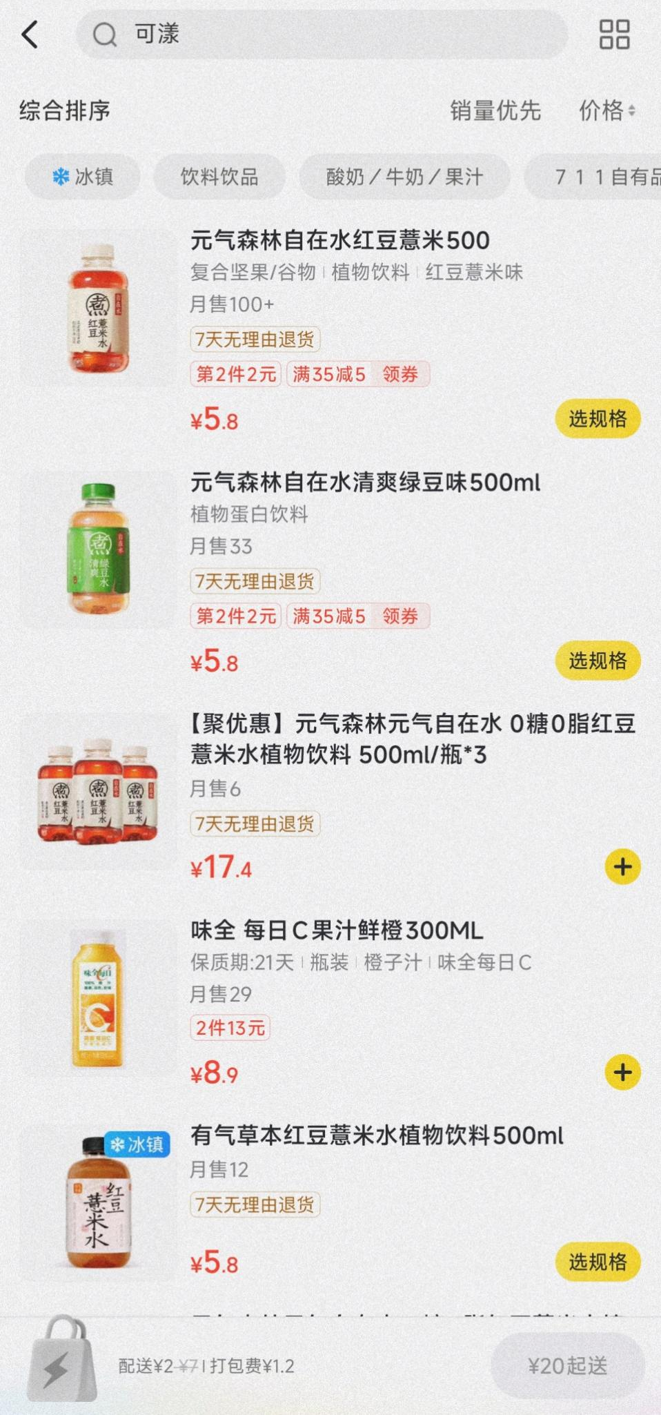 不仅如此,在北京多地的711便利店的线上平台搜索“可漾”品牌的关键词,搜索结果均显示没有该商品,而推荐了元气森林好自在或好望水等品牌的养生水。