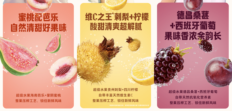 饮料的第一要素是什么?好喝、好喝、好喝!不好喝,就没有稳定复购,营养健康也就成了空谈。除了单一维生素,“多维计划”每个SKU还添加了不同富含维生素的超级水果,推出“芭乐+蜜桃+维生素B6”“刺梨+柠檬+维生素C”“桑葚+红葡萄+维生素E”三个口味组合,并且果汁含量10%,原料水果都是来自知名产地,比如贵州黔东南的刺梨、蒙阴的蜜桃,德昌的桑葚,甚至来自西班牙酿酒品种的Bobal葡萄,再通过整果压榨保留更多果肉及风味成分,使得产品在口感这一项也能高分交卷。