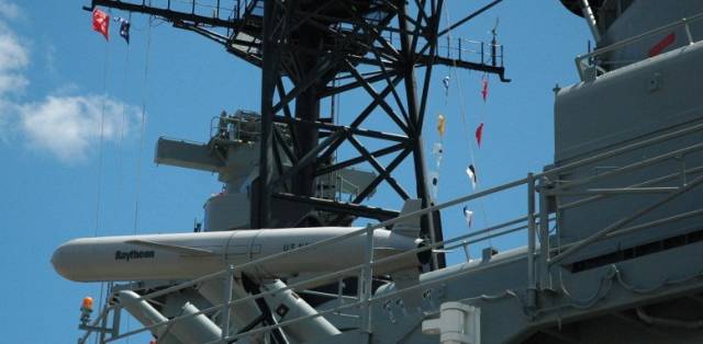再就是战斧巡航导弹了。1984年的现代化改装中,密苏里号拆除了4座5英寸双联装副炮和全部的小口径防空炮。在原来的位置安装了战斧巡航导弹、鱼叉反舰导弹和密集阵近防炮。其中威力最为强大的就是BGM-109“战斧”巡航导弹了。