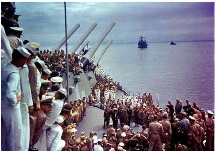 密苏里号相比其他战列舰最大的荣誉就是在其甲板上举行的日本投降签字仪式,这让密苏里号狠狠的硬了一把。也就是因为这个,战争结束后,没有像其他几个同伴一样被立刻解除现役。朝鲜战争二次战役时,密苏里号还在朝鲜的兴南港掩护美海军陆战一师的撤离。
