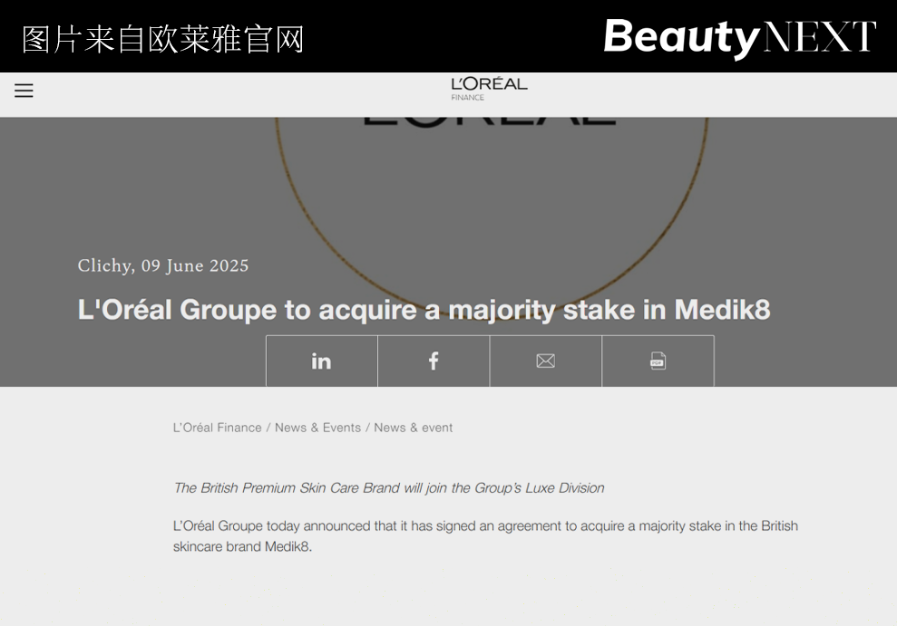 经过近一个月的谈判,欧莱雅对英国功效护肤品牌Medik8的控股收购正式完成,该品牌将被整合至集团高档化妆品事业部。