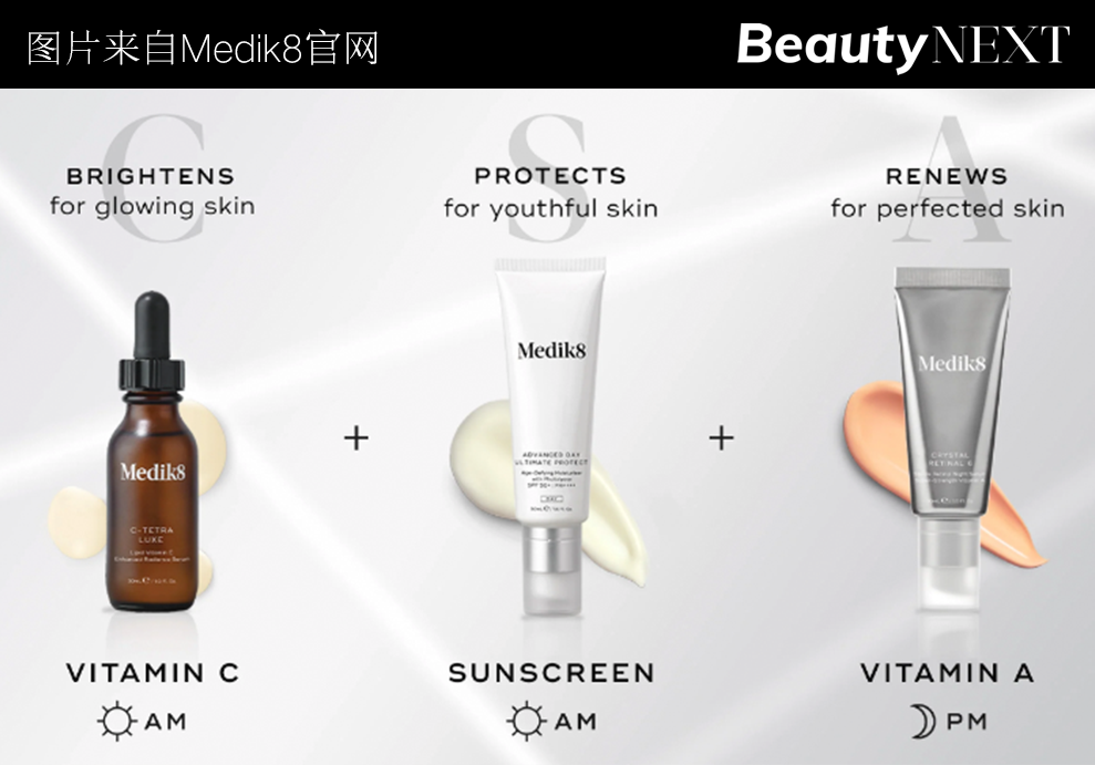 Medik8堪称这一护肤理念的先驱。其独创的“CSA护肤哲学”也正是当下风靡中国市场的“早C晚A”理念的逻辑原型。