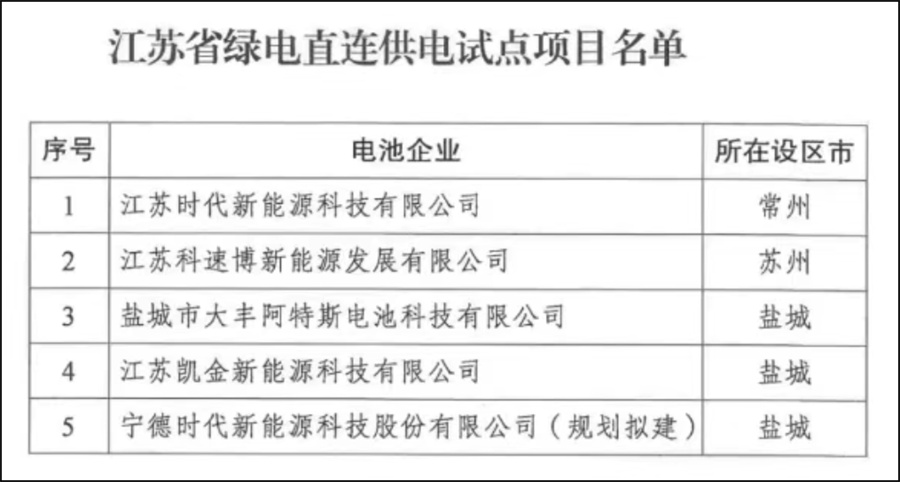 江苏的绿电直连方案,出发点就是用新能源来为动力电池企业降电价,首批入选动力电池企业为常州时代新能源科技有限公司等5家企业。5家企业将直接从风电场、光伏电站获取绿电。这也是全国率先开展的动力电池企业绿电直连创新试点。