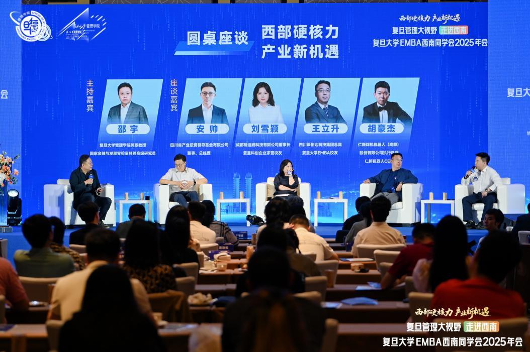 圆桌座谈环节,复旦大学管理学院兼职教授、国家金融与发展实验室特聘高级研究员邵宇,与四川省产业投资引导基金有限公司董事、总经理安帅,仁新焊机机器人(成都)股份有限公司执行总裁、仁新机器人CEO胡豪杰,成都瑞迪威科技有限公司董事长、复旦科创企业家营校友刘雪颖,四川沃佑达科技集团总裁、复旦大学EMBA校友王立升,围绕“西部硬核力 产业新机遇”等话题进行深入探讨。