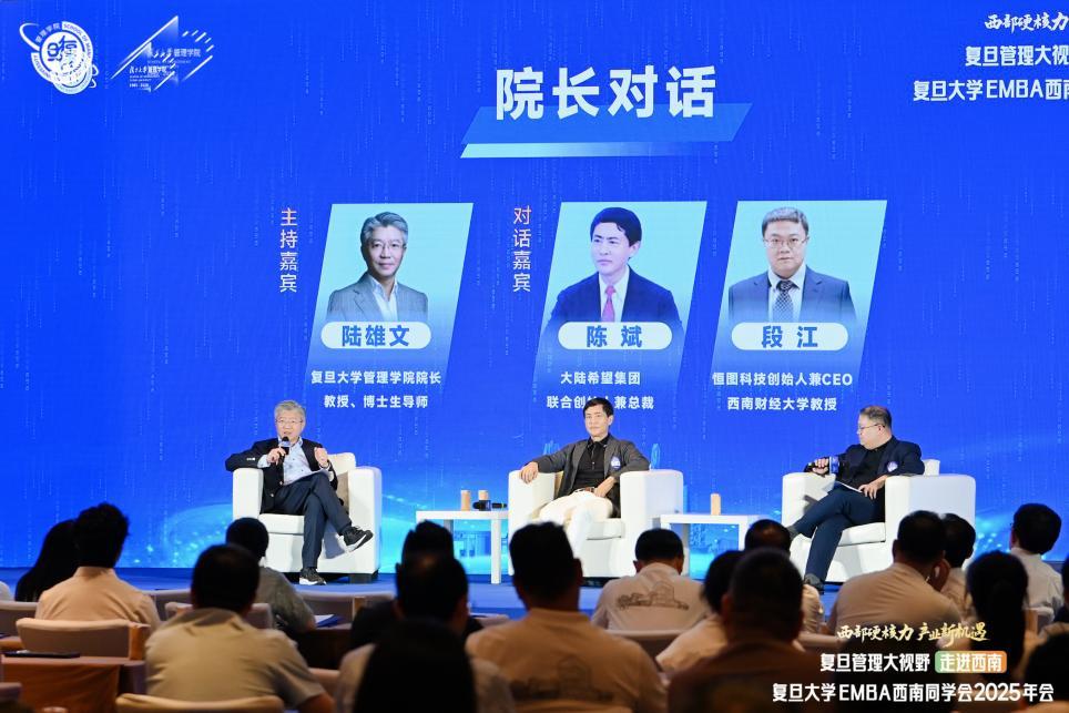 院长对话环节,陆雄文院长与大陆希望集团联合创始人兼总裁陈斌,恒图科技创始人兼总裁、西南财经大学教授段江,围绕技术出海、科技创新等话题展开精彩讨论。