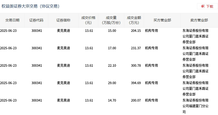 6月23日,麦克奥迪大宗交易成交97.8万股,成交额1331.06万元,占当日总成交额的20.77%,成交价13.61元,较市场收盘价15.29元折价10.99%。