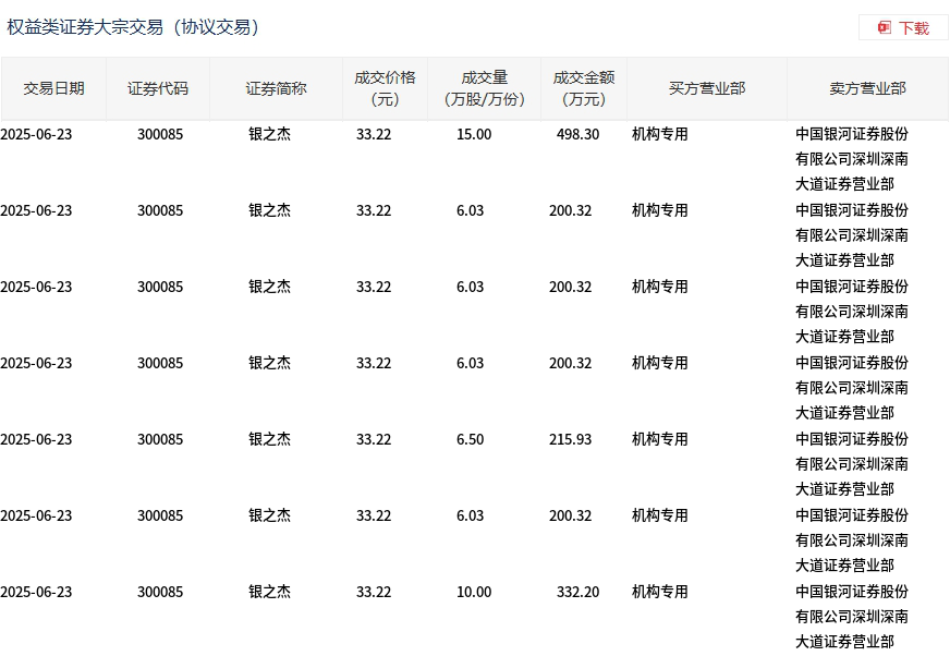 6月23日,银之杰大宗交易成交55.62万股,成交额1847.71万元,占当日总成交额的0.96%,成交价33.22元,较市场收盘价38.52元折价13.76%。