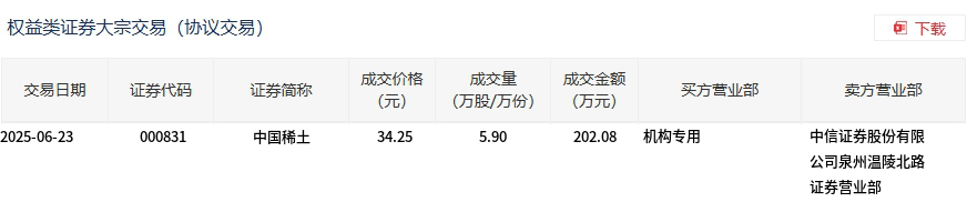 中国稀土今日大宗交易平价成交5.9万股,成交额202.08万元
