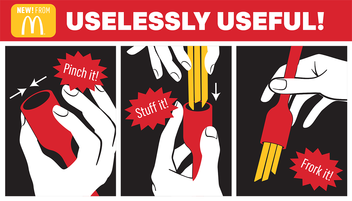 看到这个玩意儿觉得一脸黑线?它可不只是来搞笑的。实际上,这款薯条叉子是麦当劳为了给新产品线造势的营销手段。
