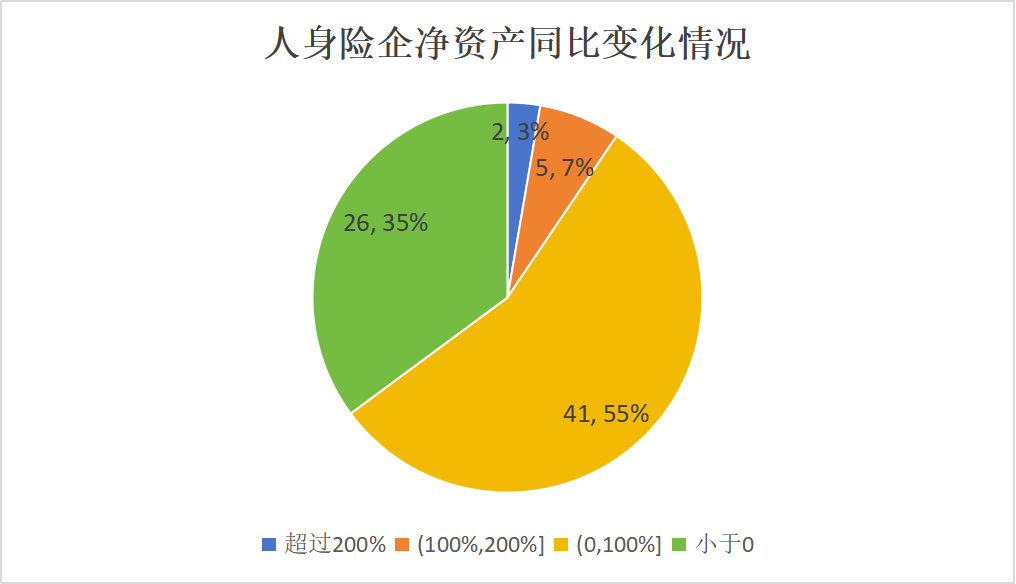 具体来看,74家人身险企中在(0,10%]区间的险企数量最多,共54家,占比达73%。其次为(10%,50%]区间,共17家险企,占比23%;2家险企净资产比率超50%,占比3%,分别为华汇人寿、新华养老。