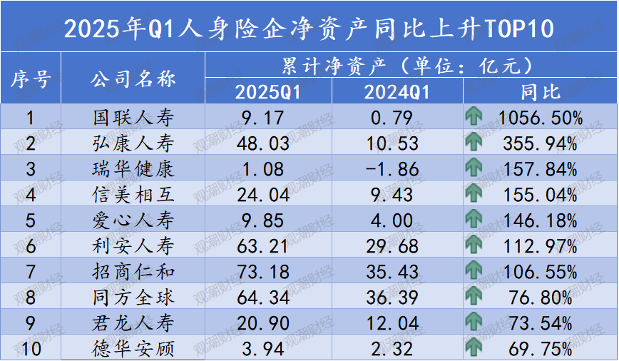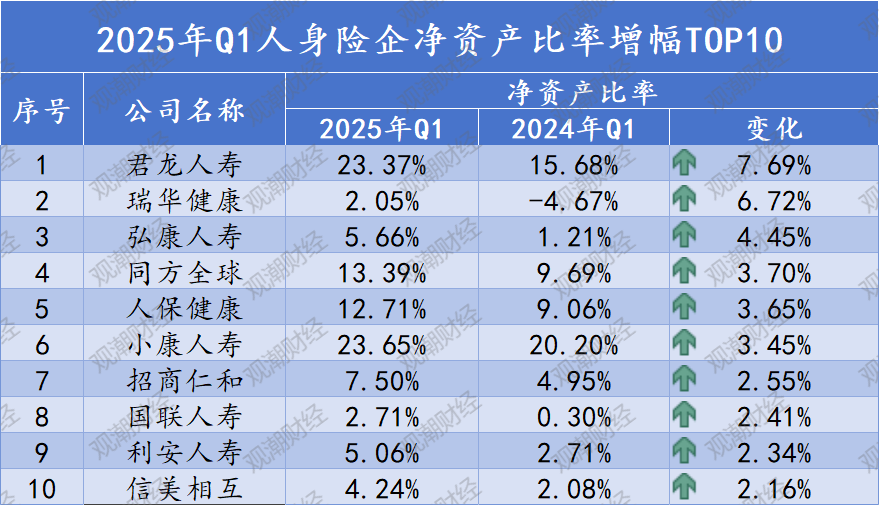其中,君龙人寿净资产比率增长最快,2025年Q1净资产比率为23.37%,较2024年Q1增加了7.69个百分点。而净资产比率增幅TOP10名单中,净资产比率本身较高的有君龙人寿、小康人寿等。