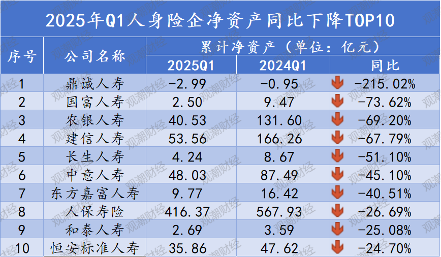 经观潮财经统计分析发现,2025年Q1净资产负增长险企中,银行系险企降幅较大,农银人寿、建信人寿均下降至百亿元以下。其中,农银人寿由131.60亿元降至40.53亿元,同比下降69.20%;建信人寿由166.26亿元降至53.56亿元,同比下降67.79%。