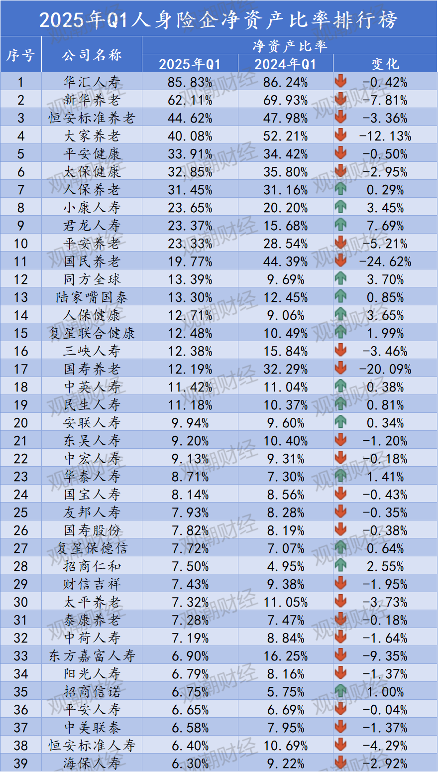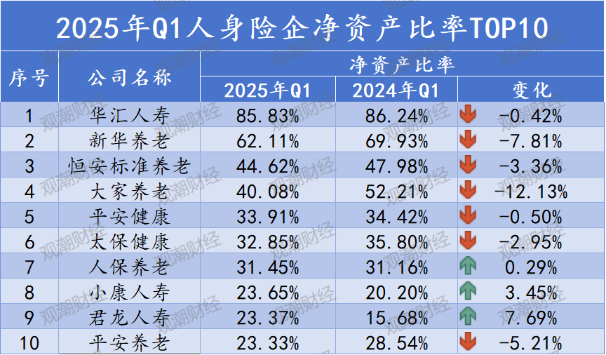 净资产比率丨前十中5家养老公司,68%险企下降