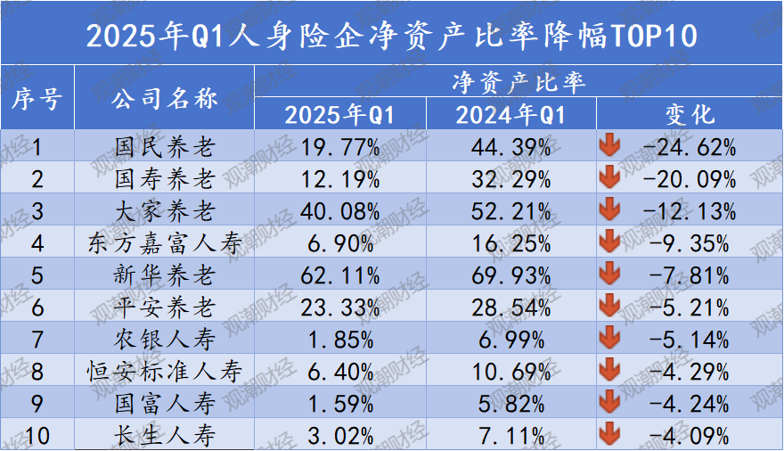 净资产比率降幅TOP10:养老、寿险公司各5家