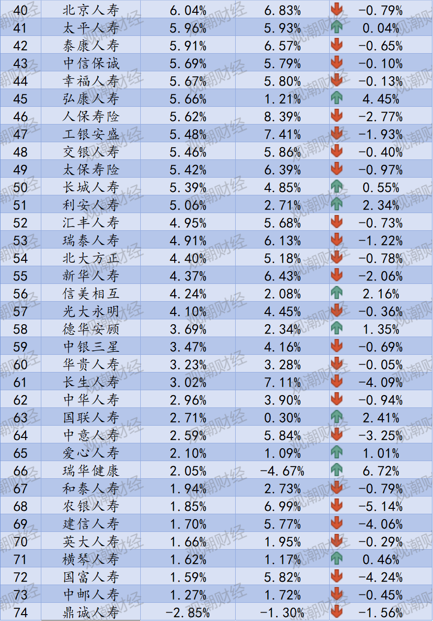 其余险企中,国富人寿、长生人寿、东方嘉富人寿、和泰人寿等四家均为中小险企个位数区间内变化;人保寿险作为中型险企变化较大。