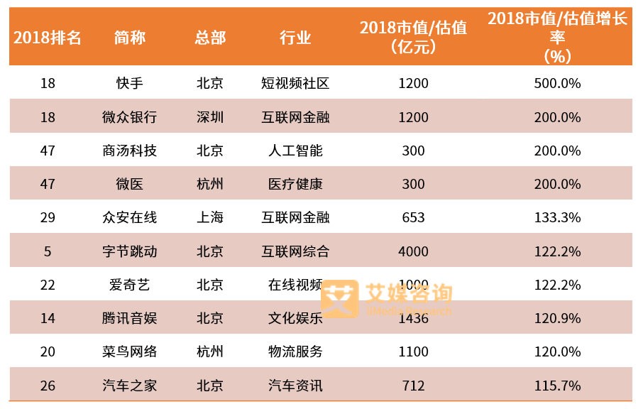 根据艾媒咨询发布的2018中国互联网企业价值榜TOP 100,互联网企业排名上升TOP10中,快手排名增长最快,商汤科技、微医、易果生鲜网、VIPKID、喜马拉雅等企业的排名上升表现抢眼。