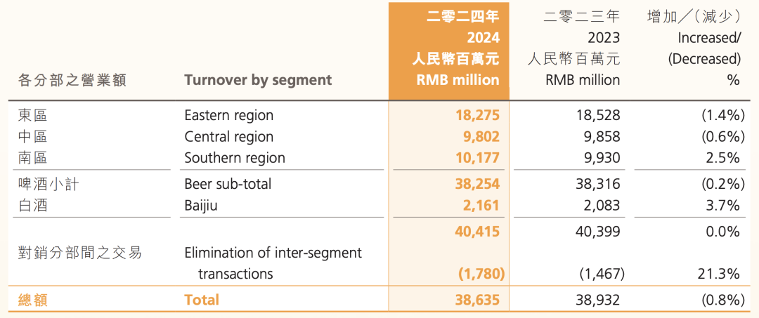 年报显示,2024年,华润啤酒实现营业收入386.35亿元,同比减少3.57%;实现净利润47.39亿元,同比减少8.03%,结束了营收逐年增长的态势。