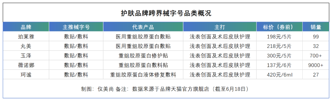 去年,上海家化旗下品牌玉泽推出两款械字号新品——玉泽重组胶原蛋白修护贴敷料和医用重组Ⅲ型人源化胶原蛋白修护液;同年9月,丸美生物推出两款二类医疗器械新品——医用重组胶原蛋白贴敷料和医用重组胶原蛋白敷料。