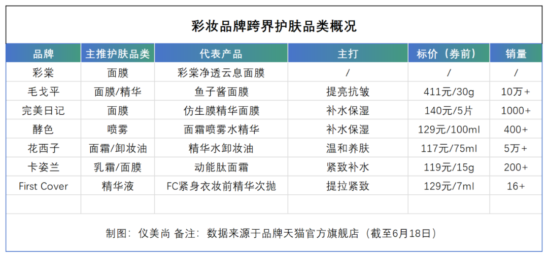 3、彩妆品牌一脚踏进护肤品,推出面膜是首选,其次是精华、面霜品类。