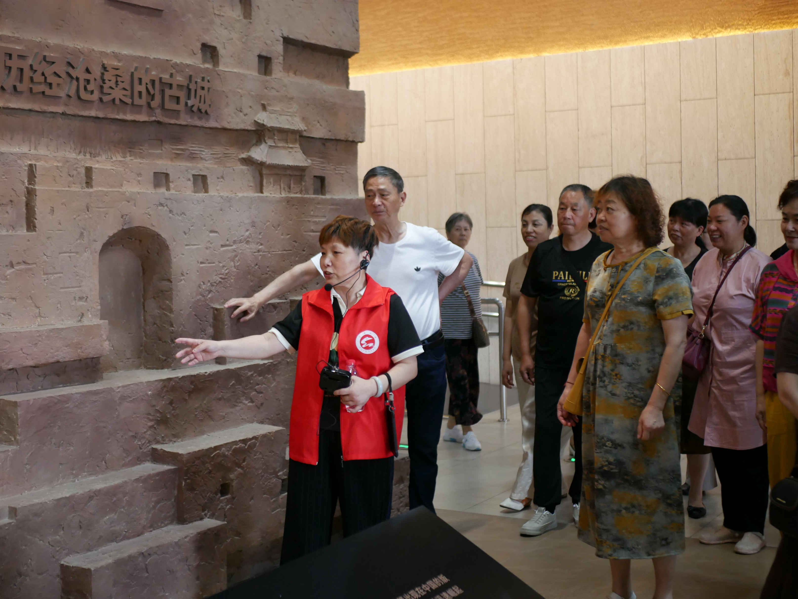 老人们早早来到集合点,在网格员的引导下,有序登上宁波公交通成物业管理有限公司的“丽园号”。随着“丽园号”缓缓启动,舒晋萍富有感染力的讲解拉开了精彩序幕。她绘声绘色地介绍沿途景点,将历史文化与自身经历巧妙融合,把罗城的故事娓娓道来。“长春门见证着老南门外曾经的热闹集市,每逢三,集市上便人来人往,大家挑着扁担买卖。而西门外每逢八也有集市,所以就有了‘三市八集来走走’这句亲切的宁波老话。”她的讲述让老人们沉浸其中,仿佛回到了那段热闹的岁月。当提到望京门时,舒晋萍更是兴致勃勃:“过去宁波学子乘船从这里出发,经浙东运河、大运河进京赶考,而当状元荣归故里,百姓便称这里为‘迎恩门’。”老人们听得津津有味,不时发出阵阵笑声与感叹。站在遗址前,老人们的思绪穿越时空,仿佛看到往昔街道上车水马龙的繁华景象,脸上洋溢着回忆的笑容。之后,在舒晋萍的带领下,老人们走进望京门城墙遗址博物馆。从古老的城墙到现代化的城市,巨大的变迁让他们感慨万千。参加活动的杨亚梅不禁感叹:“没想到罗城变化这么大,我们的城市发展得越来越好啦!”