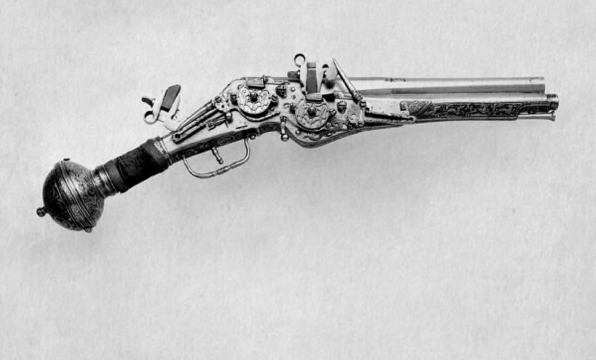 第四张: 图为1580年德制的双管双簧轮手枪。在20世纪初弹夹被普遍应用之前,双管枪提高了原有的一枪一装弹模式的效率和威力。
