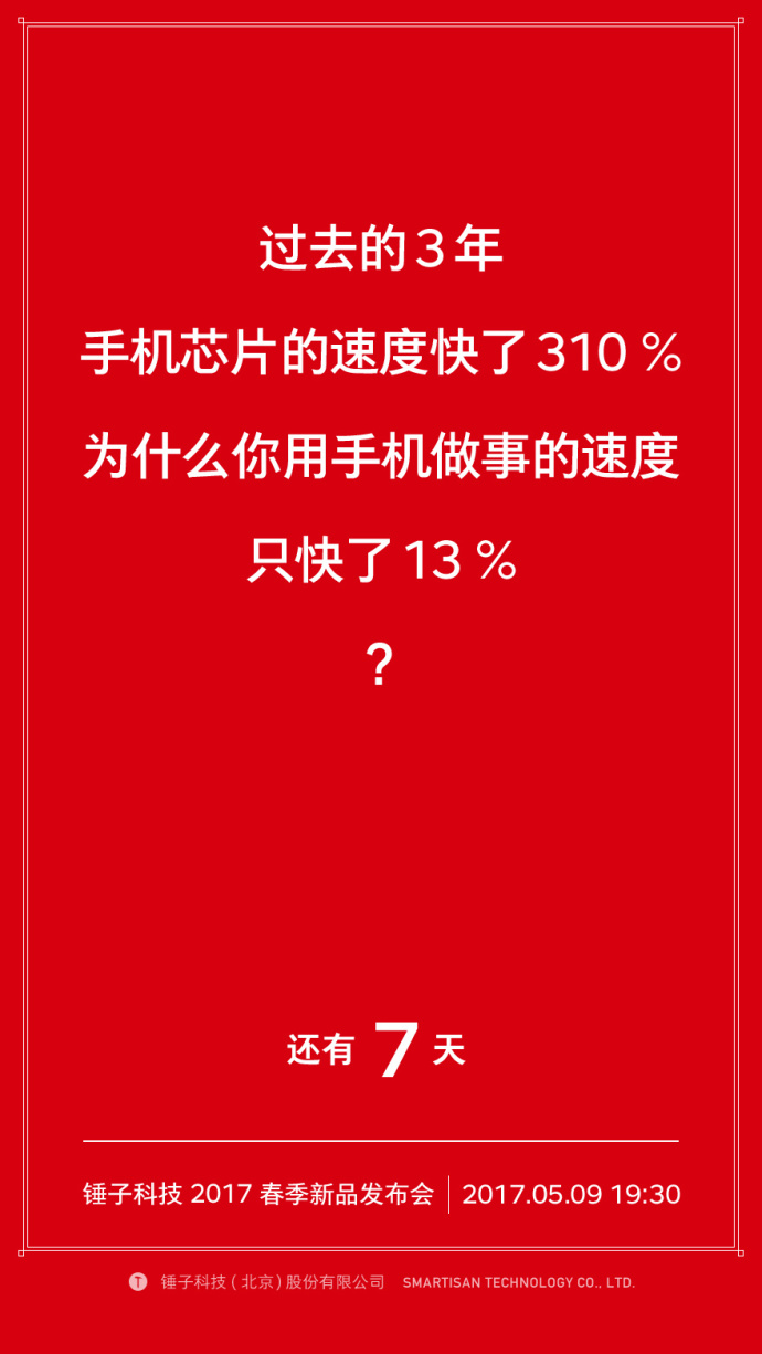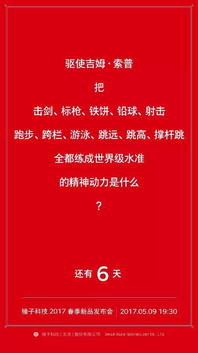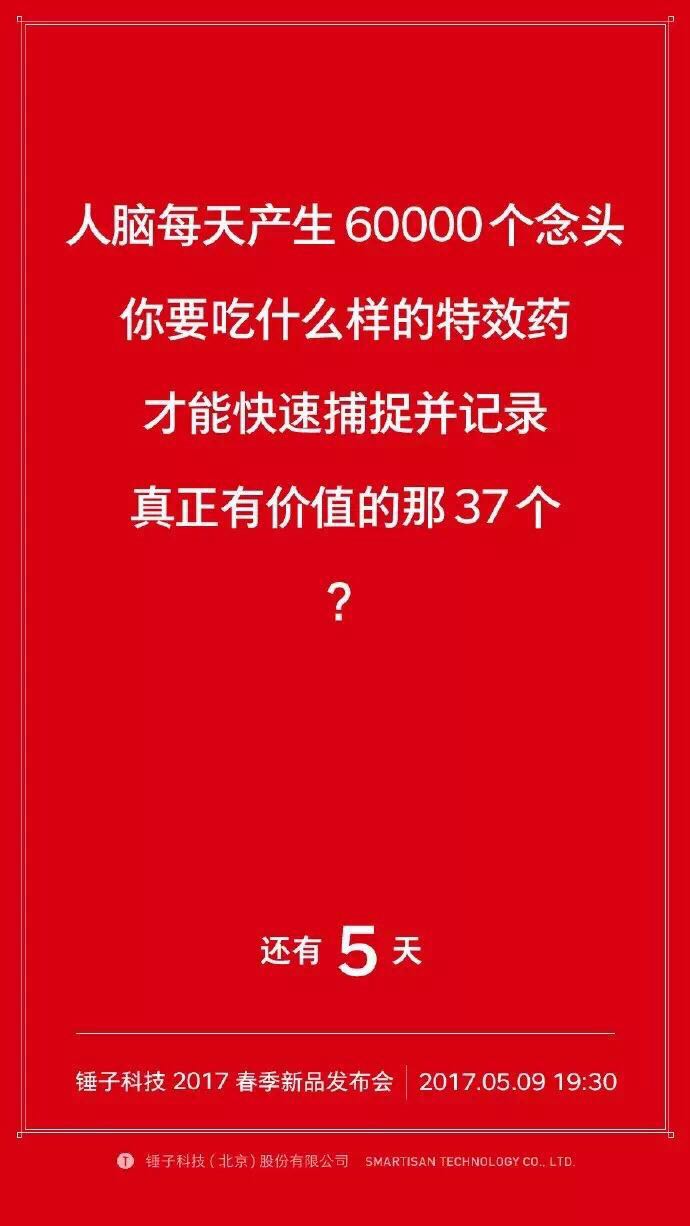 不过对锤子发布会来说,悬疑风格的倒计时海报才是一项传统。每次发布会前,锤子科技的倒计时海报都会甩出一连串关于手机设计的问题,让受众不禁好奇这次老罗会用怎样的方式解决这些痛点。也为发布会增加了悬念和看点。而今年的倒计时海报也已经发布了三张。