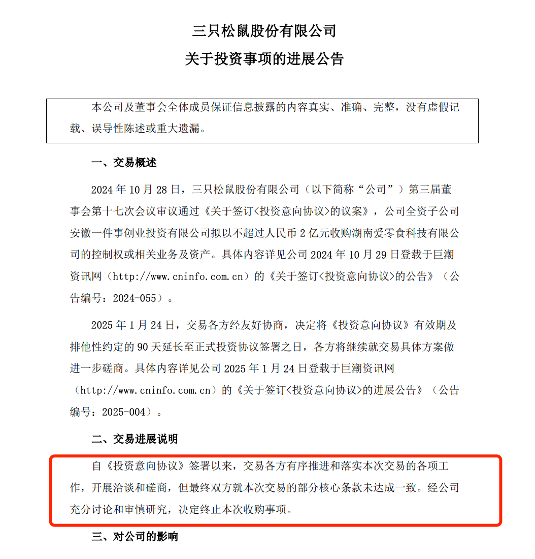 6月16日,三只松鼠公告称,去年10月,其全资子公司拟以不超过2亿元收购爱零食的控制权,但最终双方就本次交易的部分核心条款未达成一致,决定终止本次收购事项。