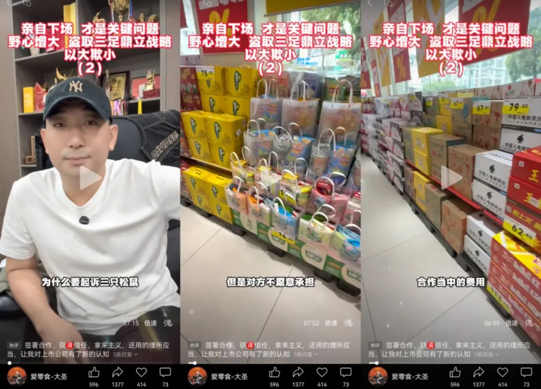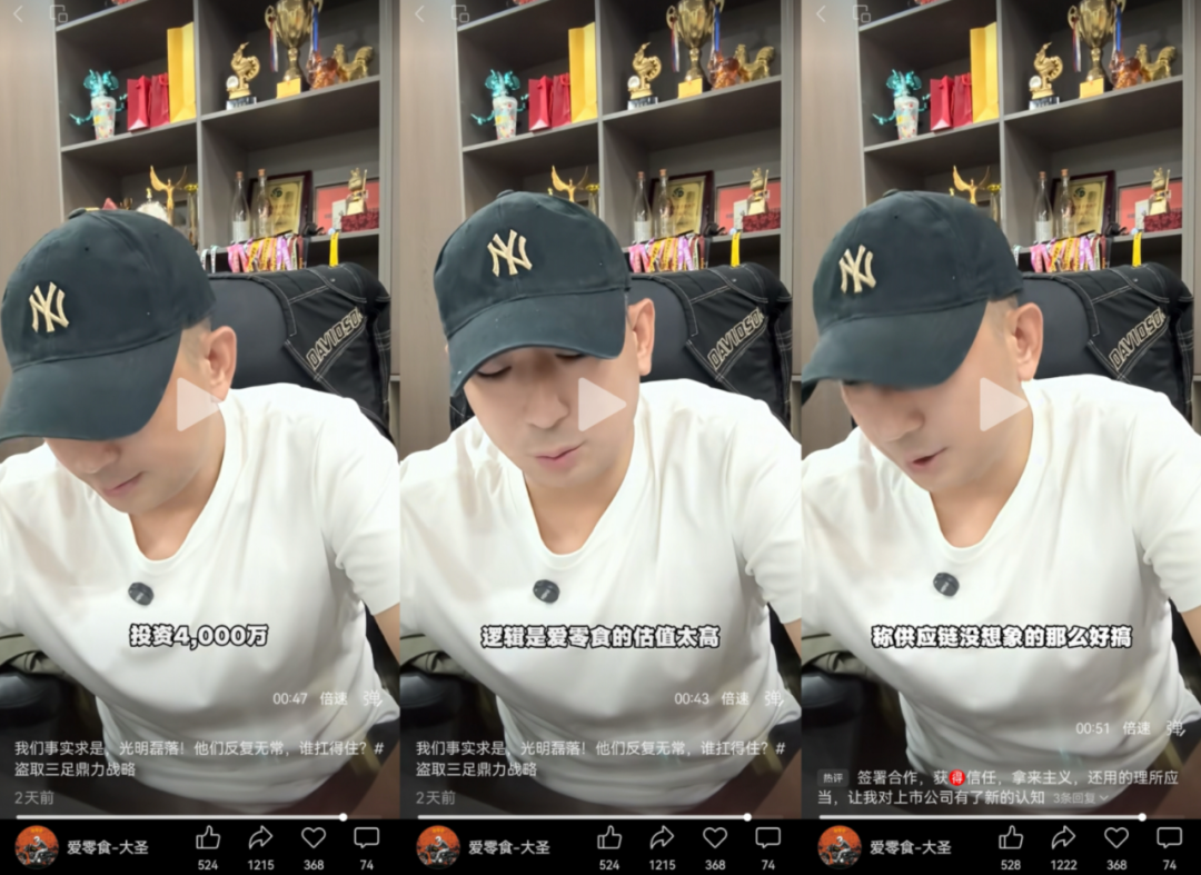 然而,这场商业联姻的“破裂”却并不平静——爱零食创始人唐光亮在收购终止后迅速通过社交平台发声,表示自己作为爱零食的创始人,有义务维持爱零食的品牌和商誉,所有分享的内容,我负法律责任。他在视频中直言“欺人太甚”,认为三只松鼠“反复压价”。